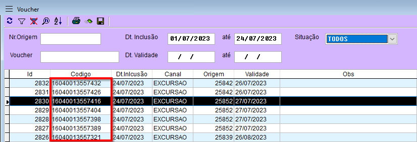 Após a comercialização de um item que gera Voucher, no caso deste cliente, via Excursão, é possível consultá-los pela tela de Voucher de produtos (Ingressos) no Volpe.
