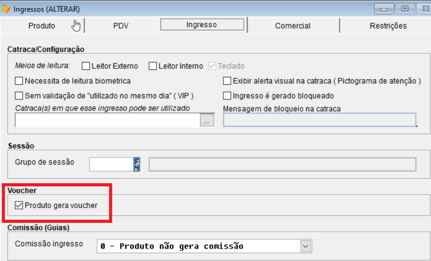 Após selecionar o produto/ingresso, atente-se a opção “Produto Gera Voucher”. Pois ela deve estar marcada para que assim que for comercializada, possa gerar uma numeração de Voucher a ser carregado no PDV.