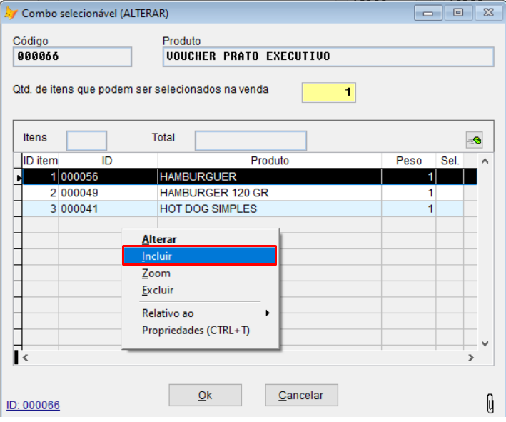 Selecione a opção de INCLUIR para selecionar o produto que será adicionado ao combo e clica em ok.
