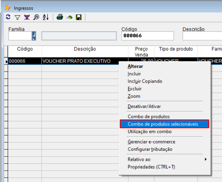 Caso o voucher gerado permita a escolha de um produto entre várias opções, é possível configurar o item como um ‘COMBO SELECIONÁVEL”.
