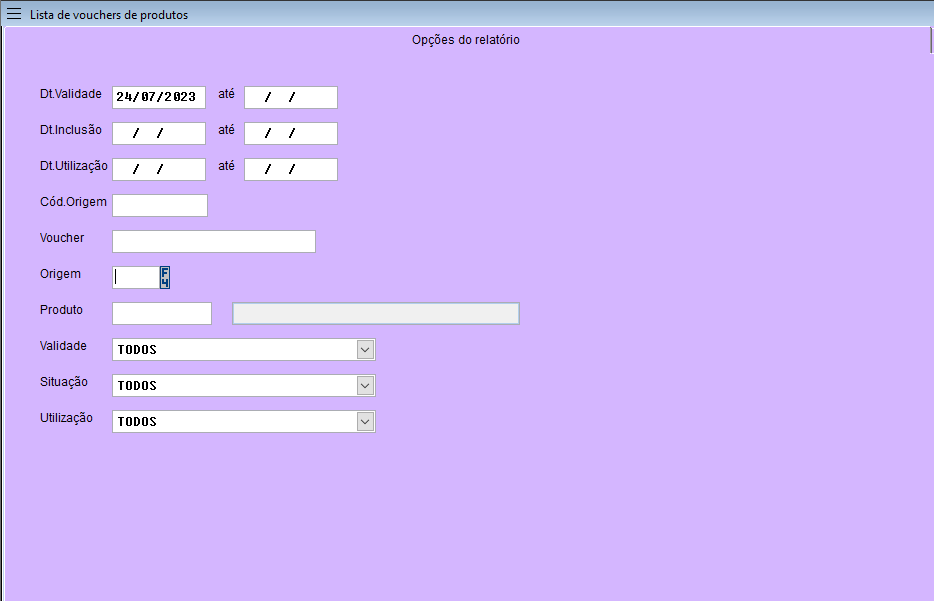 Para consultar os vouchers em aberto/finalizados/disponíveis, entre outras informações, podemos utilizar o relatório Lista de voucher de produtos (Ingressos) no Volpe.