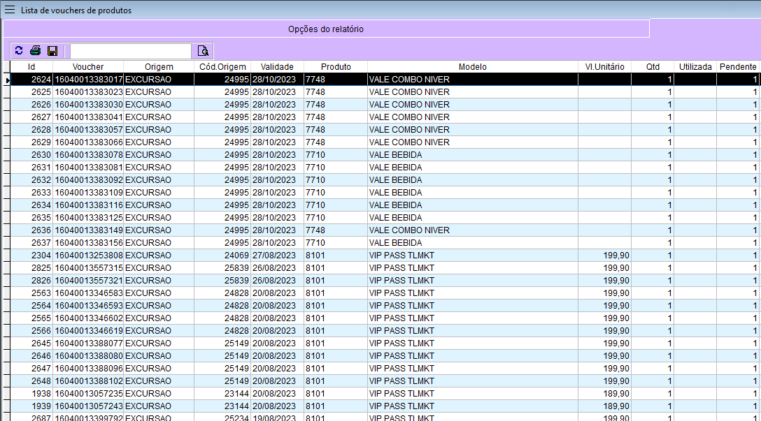 Na grade de consulta o sistema exibe algumas colunas principais como NRO. DO VOUCHER, ORIGEM (nesse caso excursão), VALIDADE, entre outras informações.