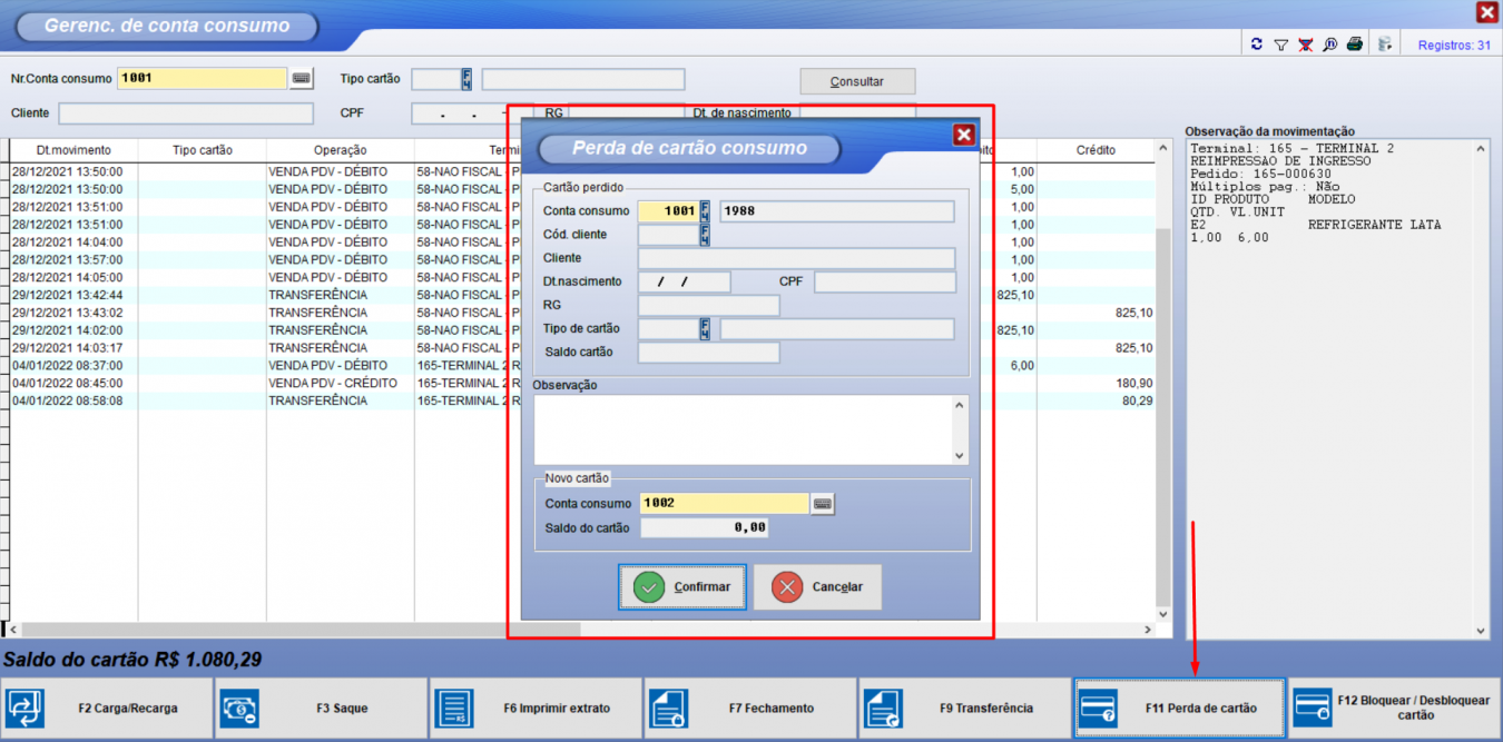 F11 Perda de Cartão