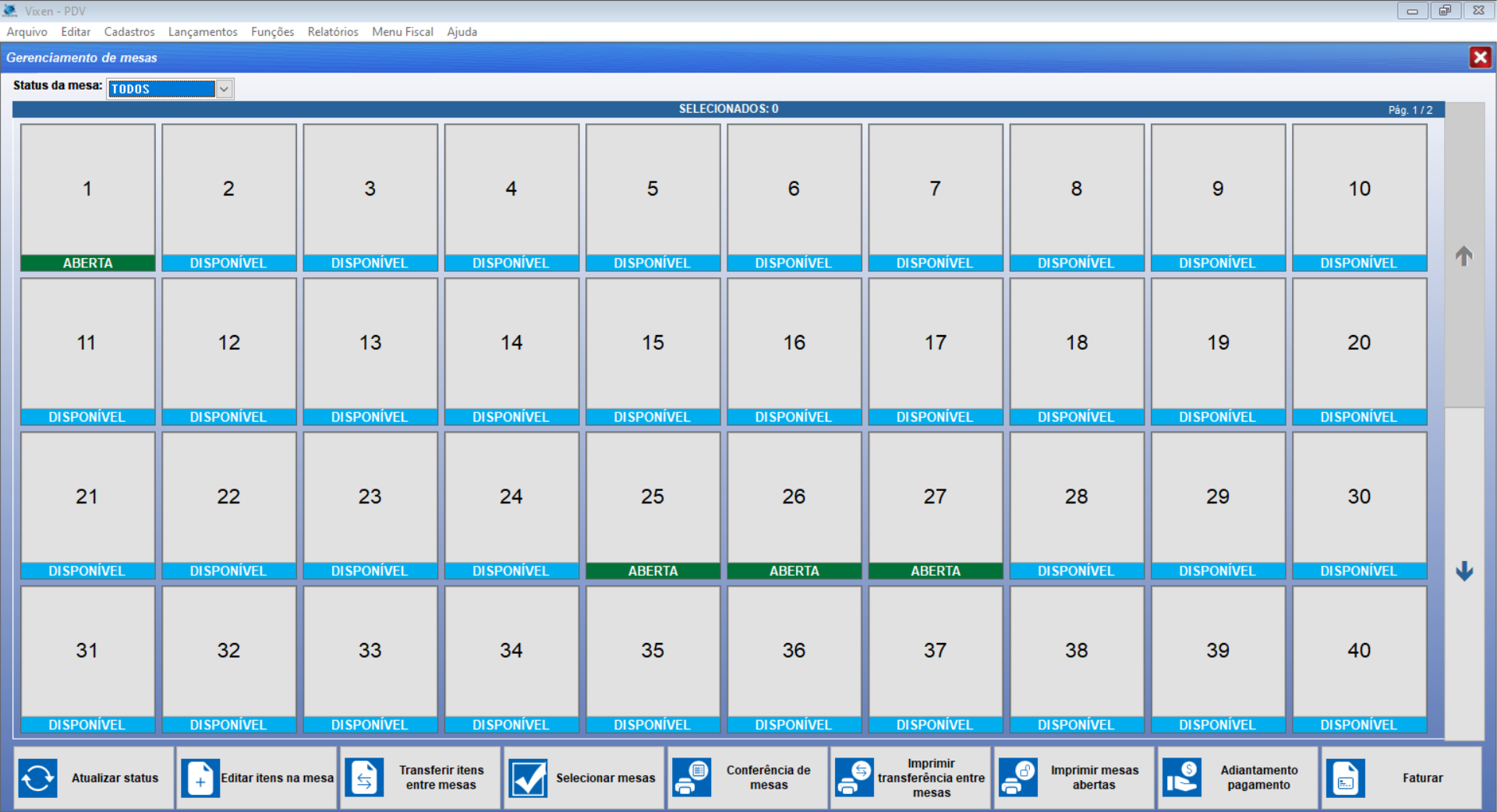 Ao clicar no botão indicado acima o sistema abrirá a tela “Gerenciamento de mesas” onde mostrará o status de todas as mesas cadastradas no sistema (Disponível ou Aberta).