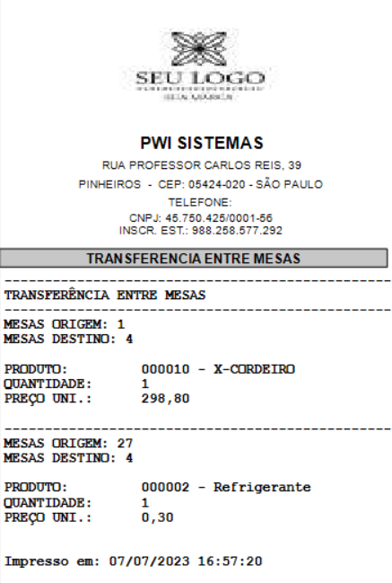 Ao abrir esta tela selecionaremos a opção “Imprimir transferência entre mesas”, assim realizando a impressão de todas as operações de transferências realizadas no dia.