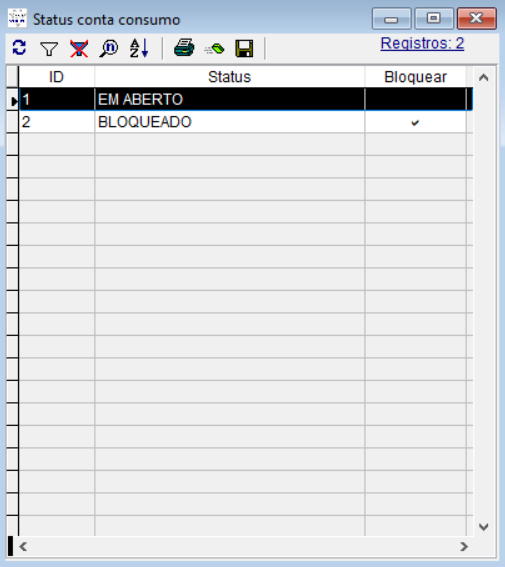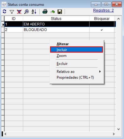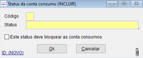 Por padrão do sistema já existem os status “EM ABERTO” e “BLOQUEADO”, porém é possível fazer a criação de mais status para serem utilizados nas contas consumos.