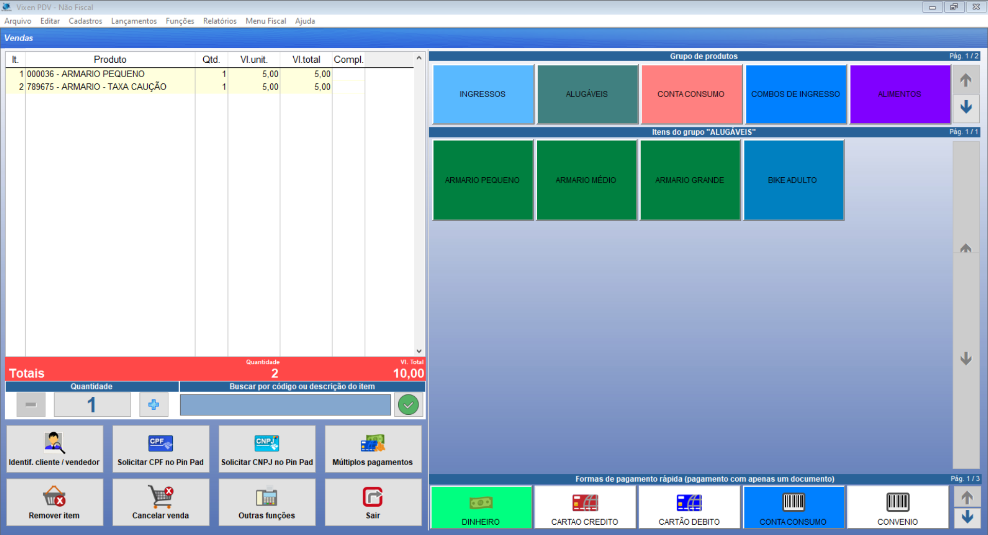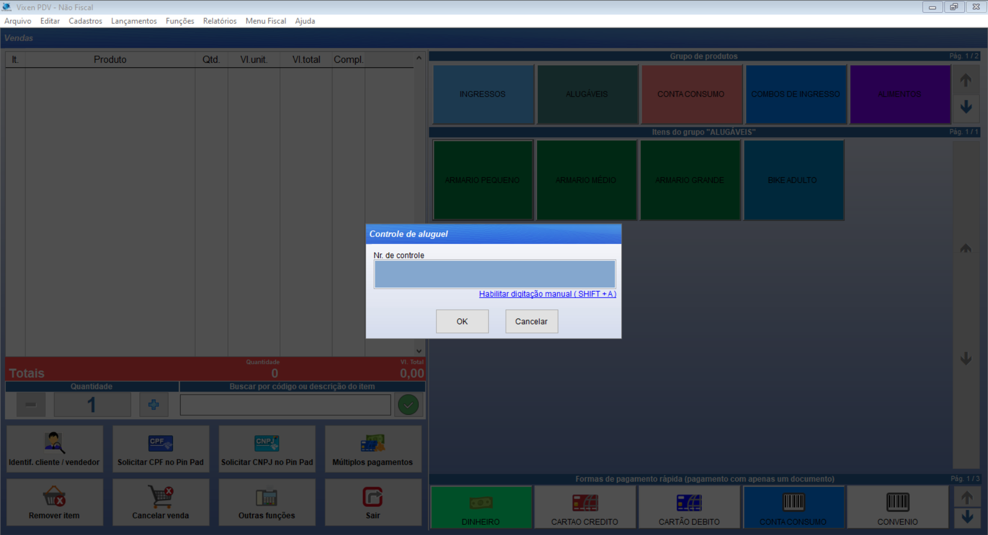 Depois de informarmos o “Nr. de Controle” o produto aluguel e a taxa caução serão adicionados na venda.