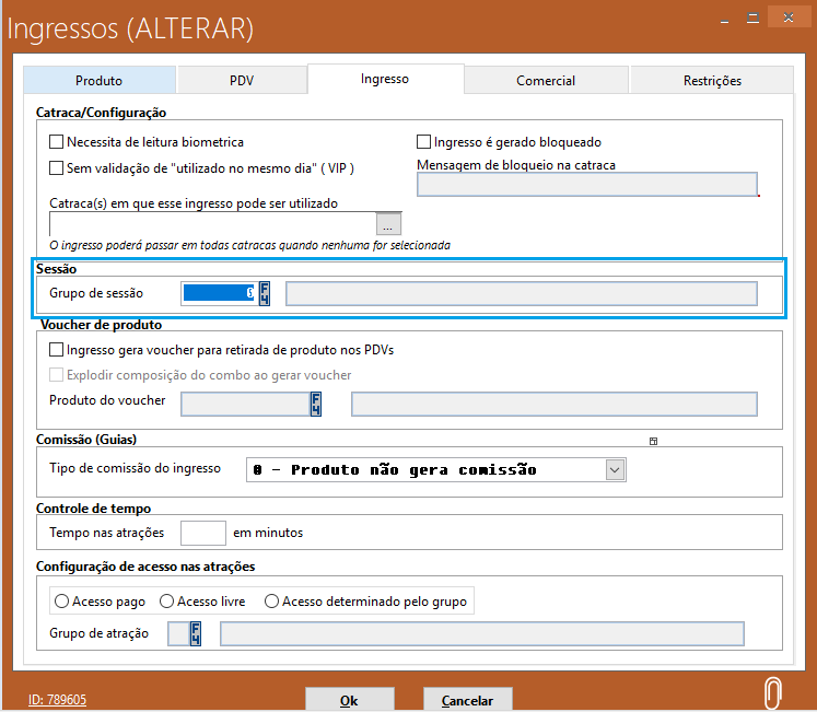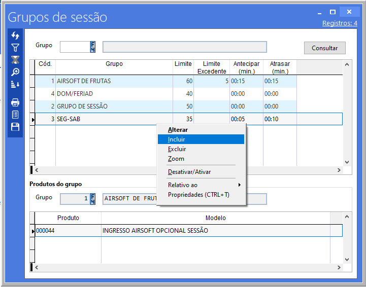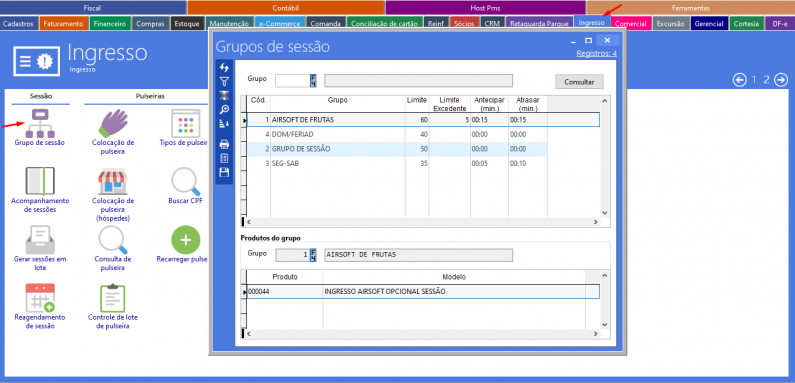 Primeiramente, vá na guia ingressos > coluna de sessão > tela de grupos de sessão. Para criar um novo grupo, clique com o botão direito > incluir, Cadastra-se então o grupo que referencia-se a uma atração. Na mesma tela, você possui uma flag chamada "validar horário de entrada da sessão na catraca", que serve justamente fazer uma validação para ver se o ingresso está sendo utilizado no horário de sessão realmente definido.