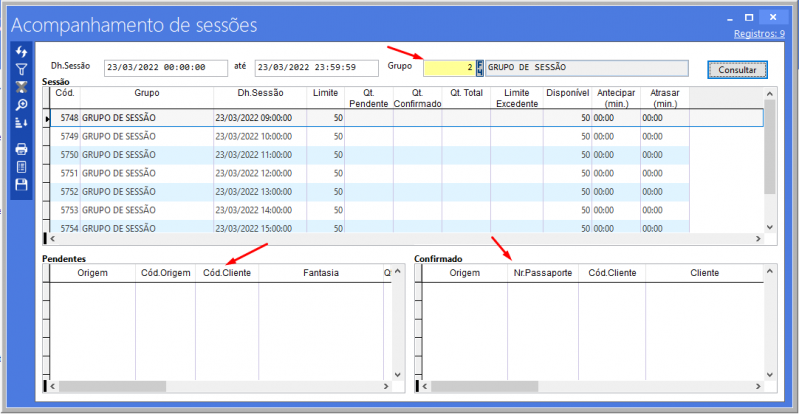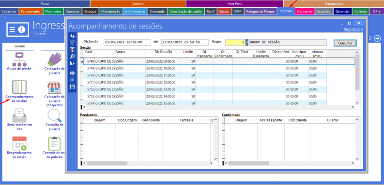 Há uma tela chamada "acompanhamento de sessões", na mesma coluna de sessões da tela de "grupos de sessão" onde é possível ver de forma ampla os grupos de sessões configurados, e verificar as pendências e confirmações das sessões vendidas. Dessa forma, é possível analisar quantos ingressos já foram vendidos em cada sessão, quantas pessoas já compraram de fato (confirmação) e quantas estão comprando (pendência).