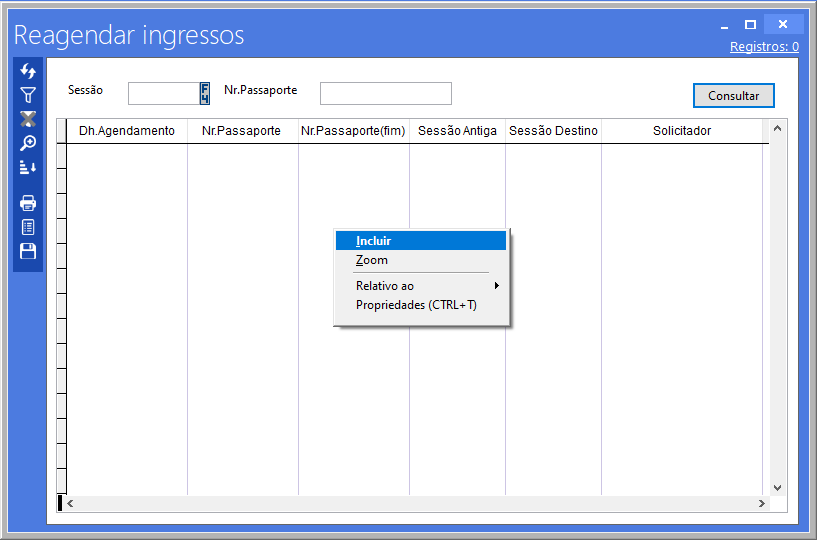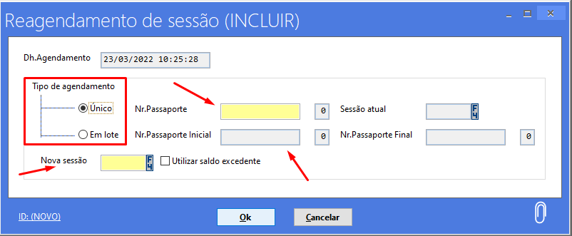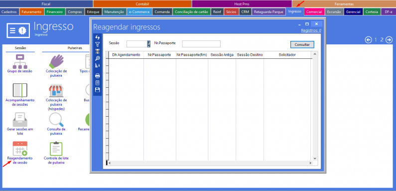 O nome desta tela, que se encontra na mesma guia e coluna das telas previamente explicadas, isto é, ingressos > sessão, é auto explicativa. Serve para reagendar um ou mais ingressos de um certo grupo de sessão, ou seja, tanto em lote, como individual. A tela é bem intuitiva, caso seja um único ingresso, basta selecionar a opção "único", colocar o "número do passaporte" e escolher a nova sessão em que aquele ingresso irá entrar. Se for em lote, basta escolher a opção "lote", e passar a numeração do ingresso inicial e final, depois escolhendo a nova sessão.