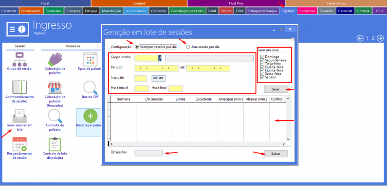 Na mesma coluna das telas anteriormente explicadas, há uma tela chamada "gerar sessões em lote". É nessa tela que as sessões com os horários e dias definidos são configurados para cada grupo de sessão previamente cadastrado. Para isso, deve-se selecionar se o grupo de sessão terá múltiplas sessões por dia ou se será apenas uma por dia, que grupo de sessão deseja-se configurar no campo "grupo de sessão", o período com data e horas definidos, e caso tenha-se escolhido que será um grupo com múltiplas sessões por dia, deve-se configurar o intervalo de uma sessão para outra, sempre em minutos, e também o horário inicial e final da primeira sessão de cada dia. Na lateral direita, seleciona-se os dias da semana em que haverá sessões dessa atração.