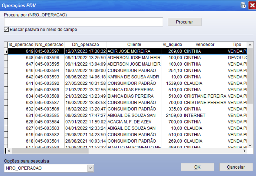 Ao selecionar o botão “Selecionar Operação” irá carregar todas suas vendas realizadas:
