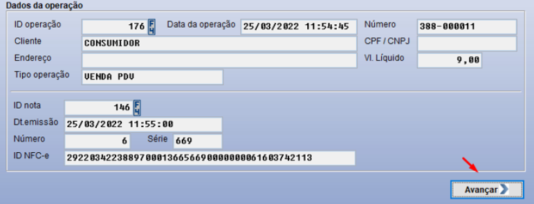 Assim que selecionada a operação, abaixo irá ser exibido os dados daquela venda, para validação e confirmação. Após isso, clicar em “Avançar”.