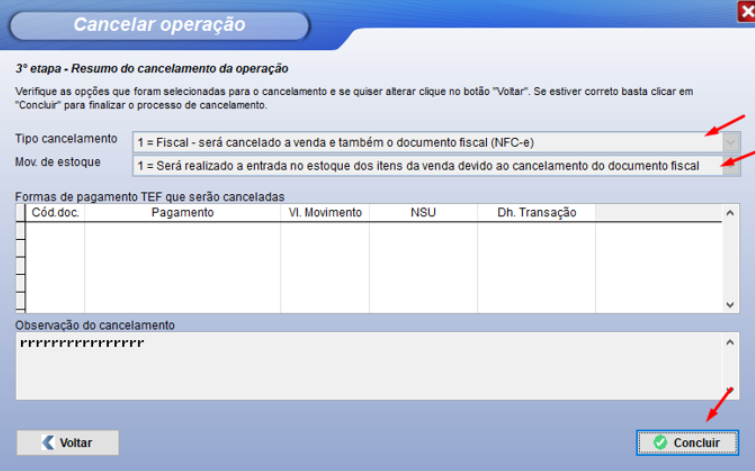 E por fim, na 3ª e última etapa do processo de cancelamento, temos a tela de “Resumo de cancelamento da operação”, que basicamente é para revisar a modalidade daquele cancelamento antes da sua realização. Caso tenha notado algo e quiser alterar, é só clicar em “Voltar”, mas caso esteja correto, clique em “Concluir” para finalizar o processo de cancelamento da venda, conforme imagem abaixo: