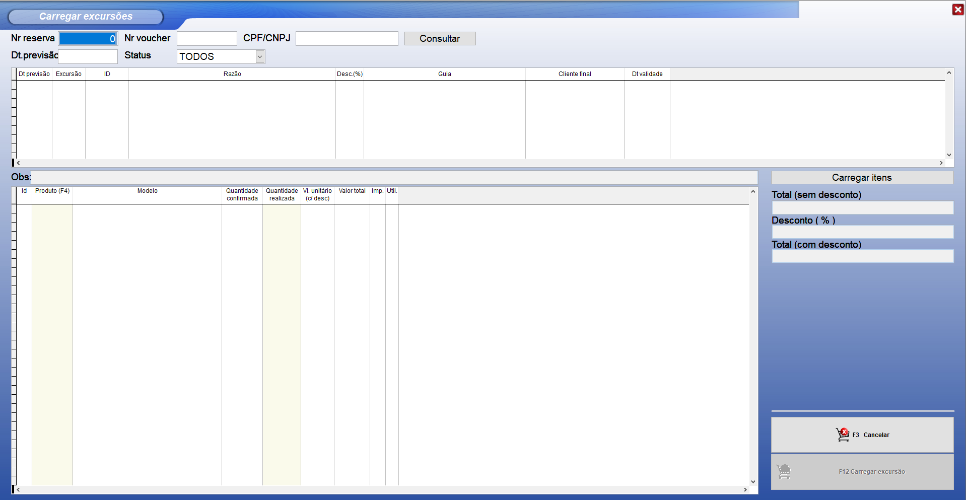 Esta opção permite carregar uma excursão já confirmada, assim realizando a impressão dos ingressos e declarando o valor que deve ser pago.