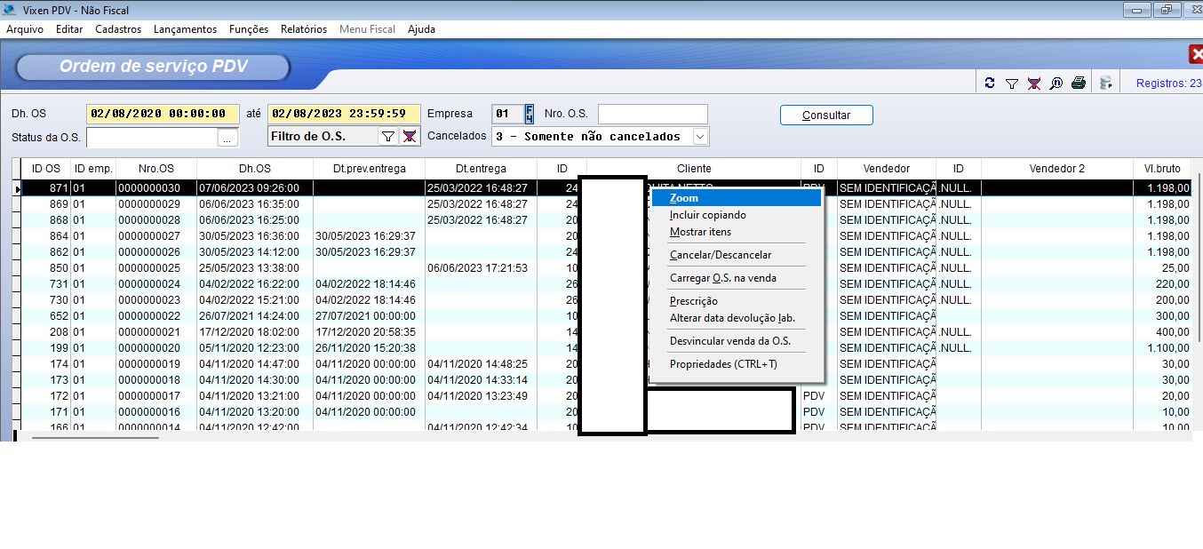 Entre elas a opção Zoom que se acessada ira aparecer uma janela com as informações pertinentes a ordem de serviço selecionada, como Itens da Ordem de serviço, formas de pagamento, dados do cliente entre outros.