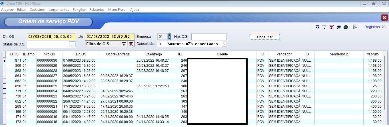 A função “Ordem de Serviço” nos permite consultar as Ordem de Serviço diretamente pelo Vixen.