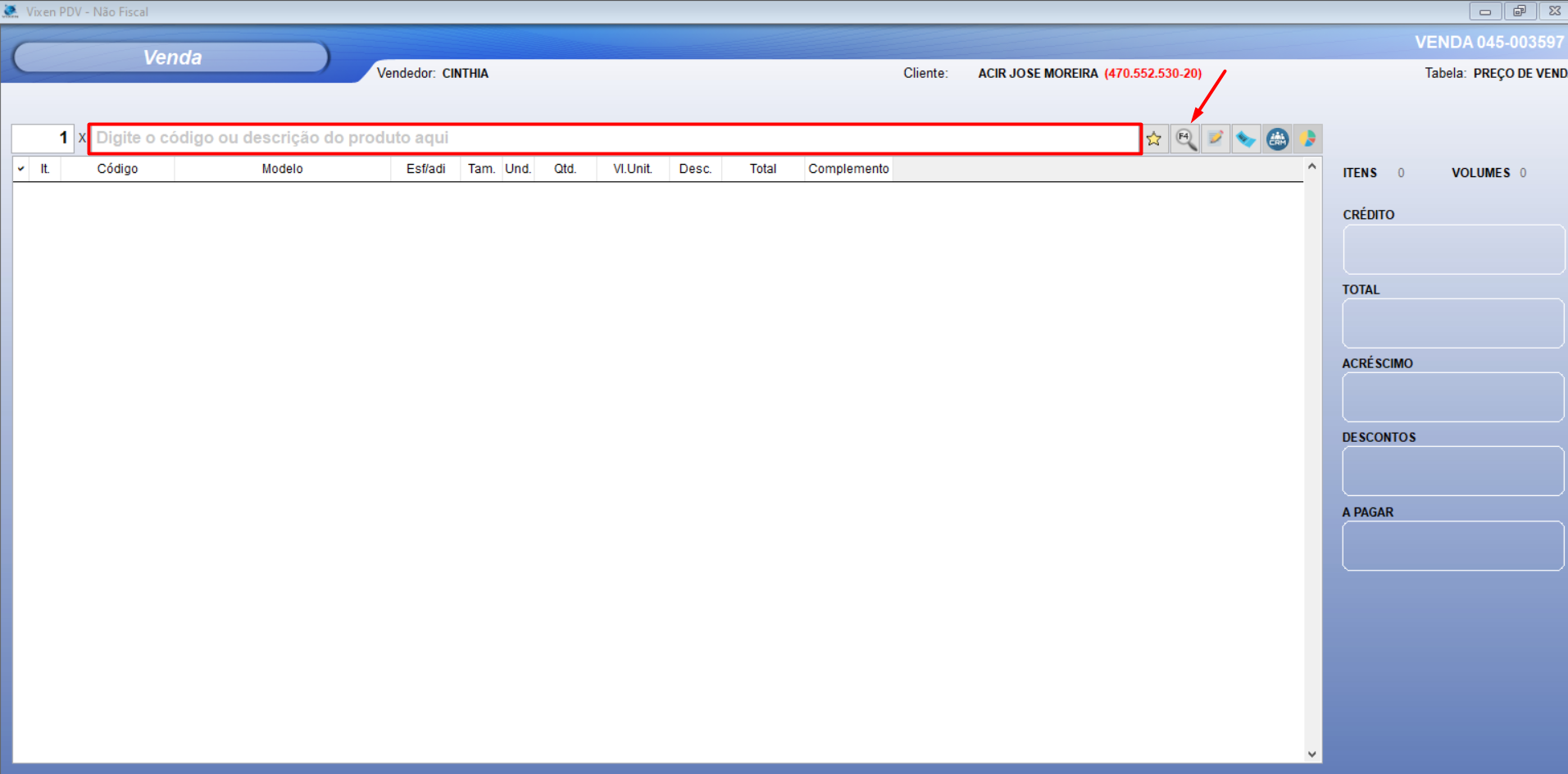 Ao entrar nessa tela, o primeiro passo é indicar o Vendedor para aquela operação. É muito importante que todas as operação de vendas seja vinculadas à um vendedor, mesmo que seja algum Padrão para que haja o controle no sistema.