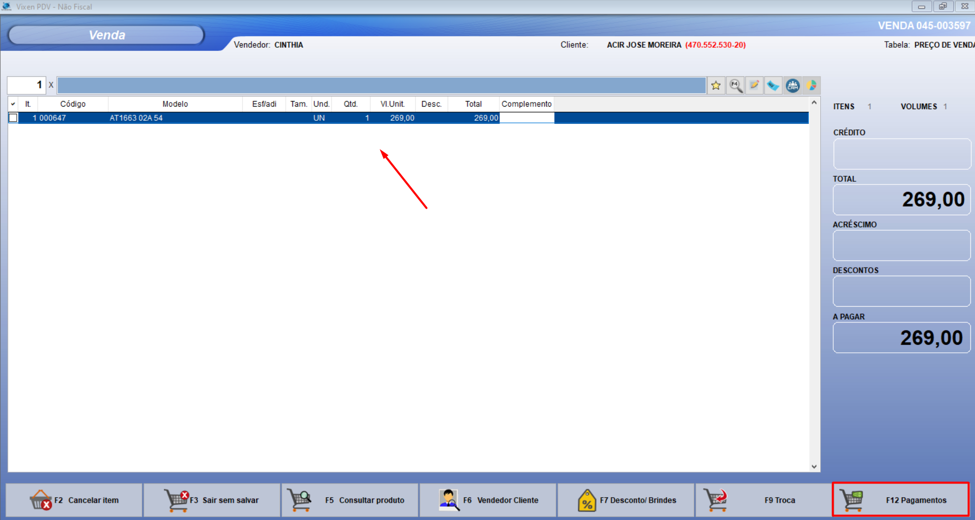 Assim que lançar o produto na grade de venda, clicamos em “F12 Pagamentos”: