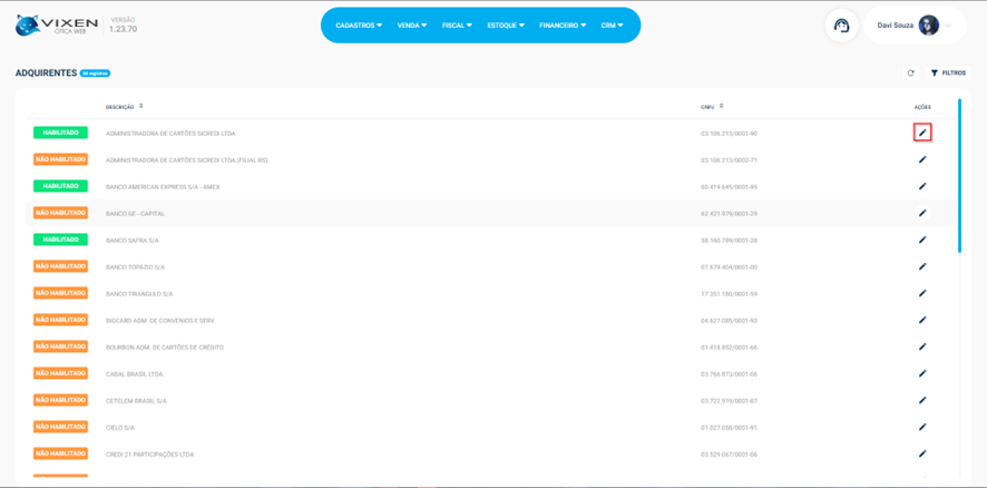 Nessa seção, podemos consultar e alterar nossos adquirentes, para realizar uma alteração, vamos clicar no ícone de lápis na linha do adquirente desejado: