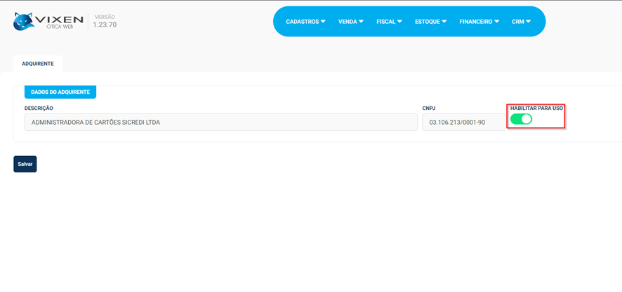 Ao clicar no ícone citado, o sistema abrirá uma tela que nos permite escolher se o adquirente será habilitado ou não para uso: