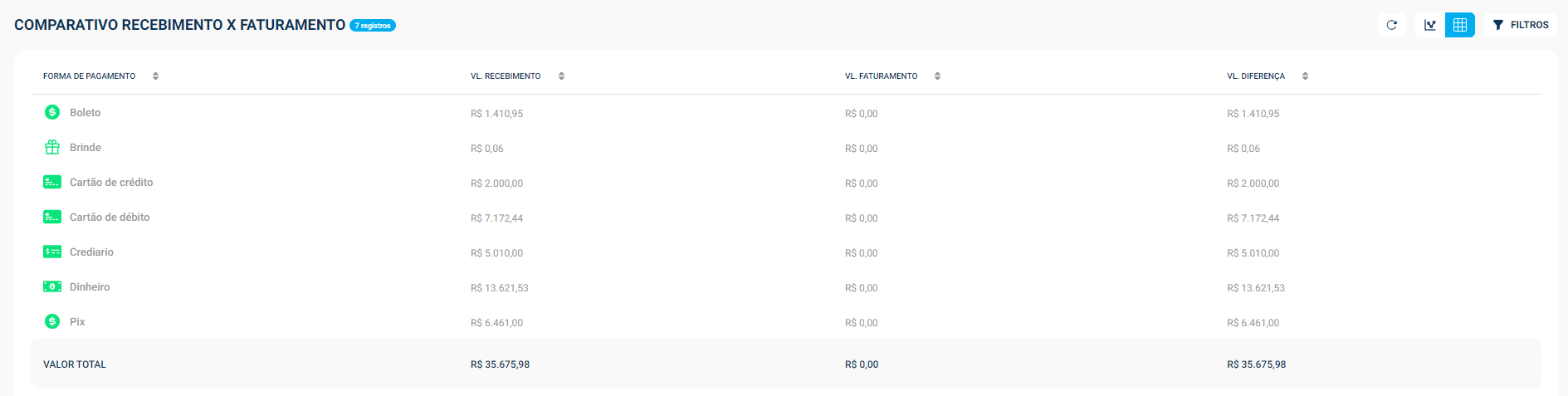 Também é possível ver listada as informações específicas sobre cada forma de pagamento, valores recebidos, faturados, e a diferença entre ambos.