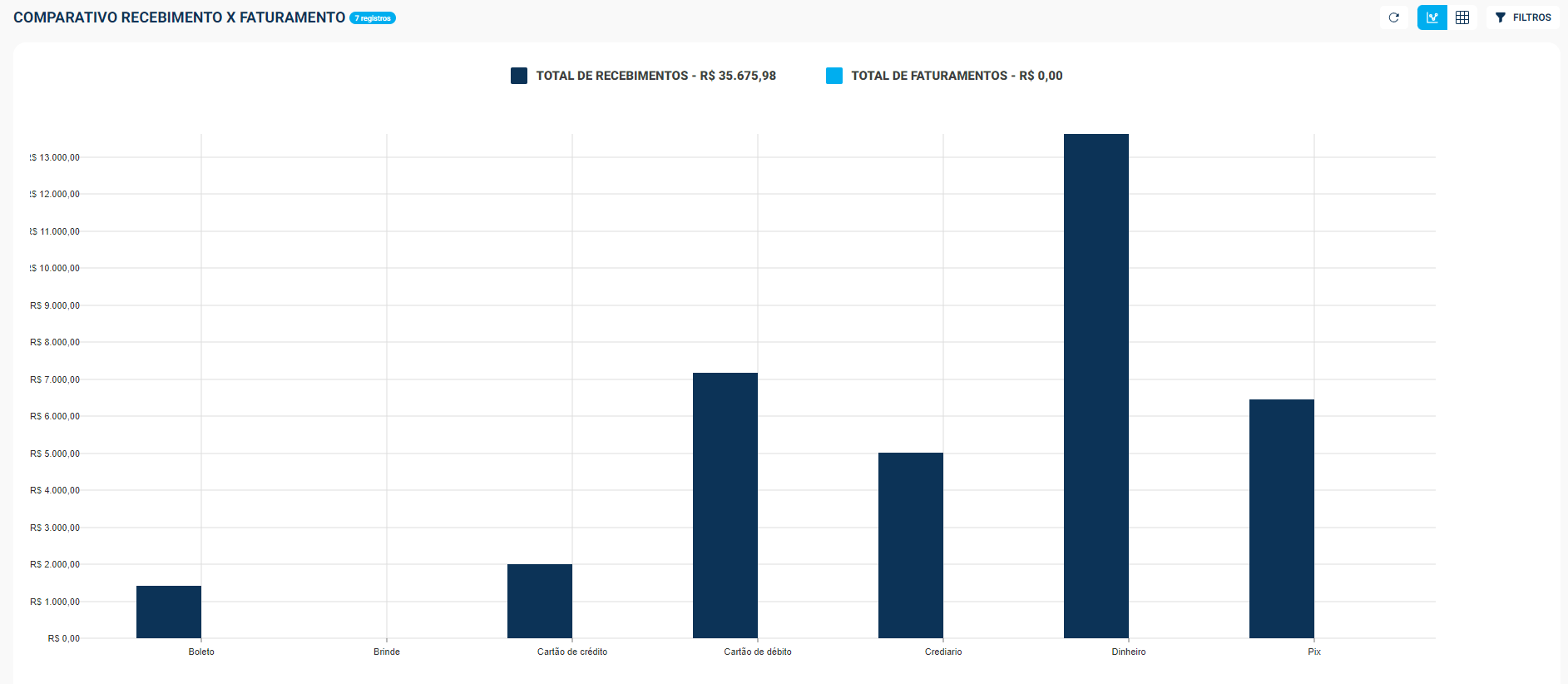 A clicar no ícone de gráfico, ao lado dos filtros, é apresentada uma representação visual dos valores entre faturamento e recebimento, segmentadas por forma de pagamento.