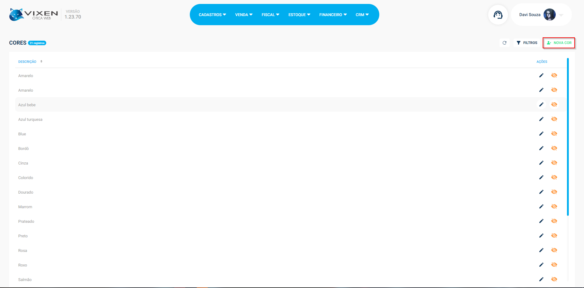 Com isso, finalizamos todo o passo a passo para cadastrar uma nova cor dentro do Vixen Ótica Web.