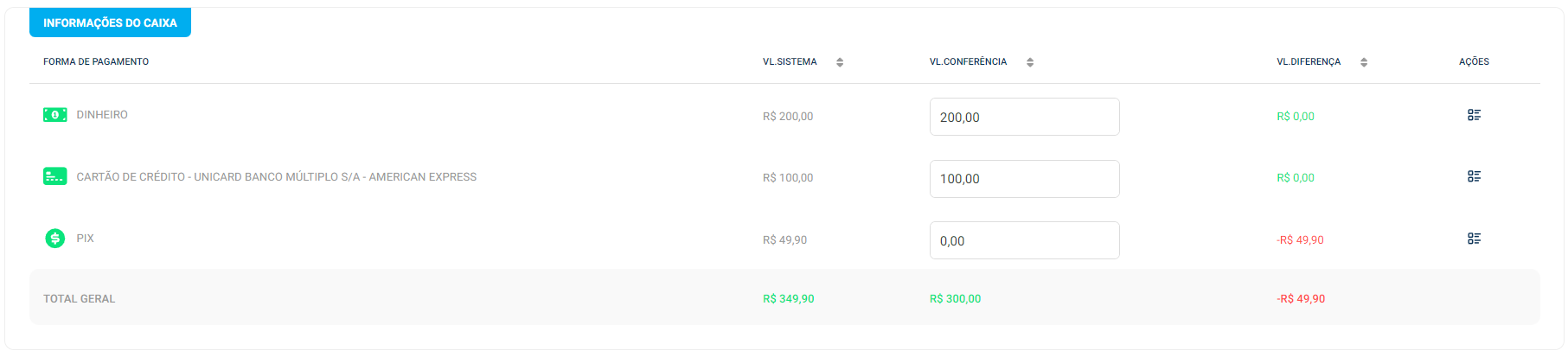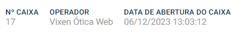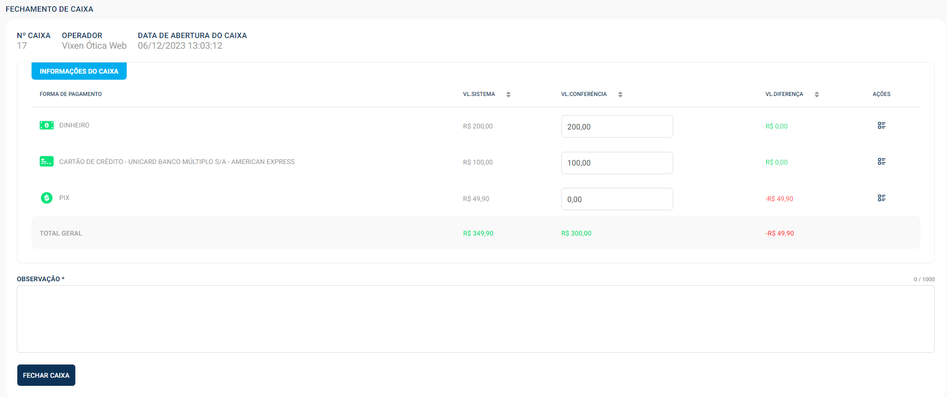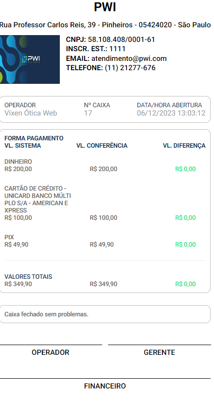 O Vixen gera um relatório impresso com informações detalhadas, incluindo forma de pagamento, valores de conferência e sistema, e a diferença, se houver, incluindo também campos para assinatura do operador, gerente e financeiro.