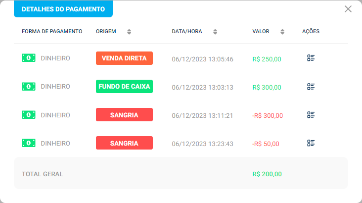 Ao usar a opção de “Visualizar”, na forma de pagamento, é possível ver detalhes das movimentações da forma de pagamento.