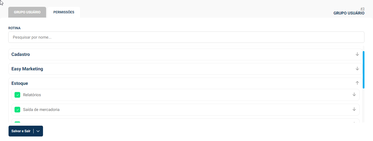Para conceder o acesso ou uma remoção da visualização desses dados, é necessário seguir o seguinte caminho, Cadastros → Administração → Grupo de Usuário e Permissões. Selecione o perfil que você deseja adicionar ou remover esse acesso e vá até a aba de “Permissões”. No campo de rotina, escreva a palavra Dashboard para visualizar as opções abaixo: