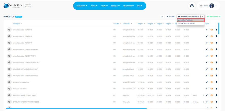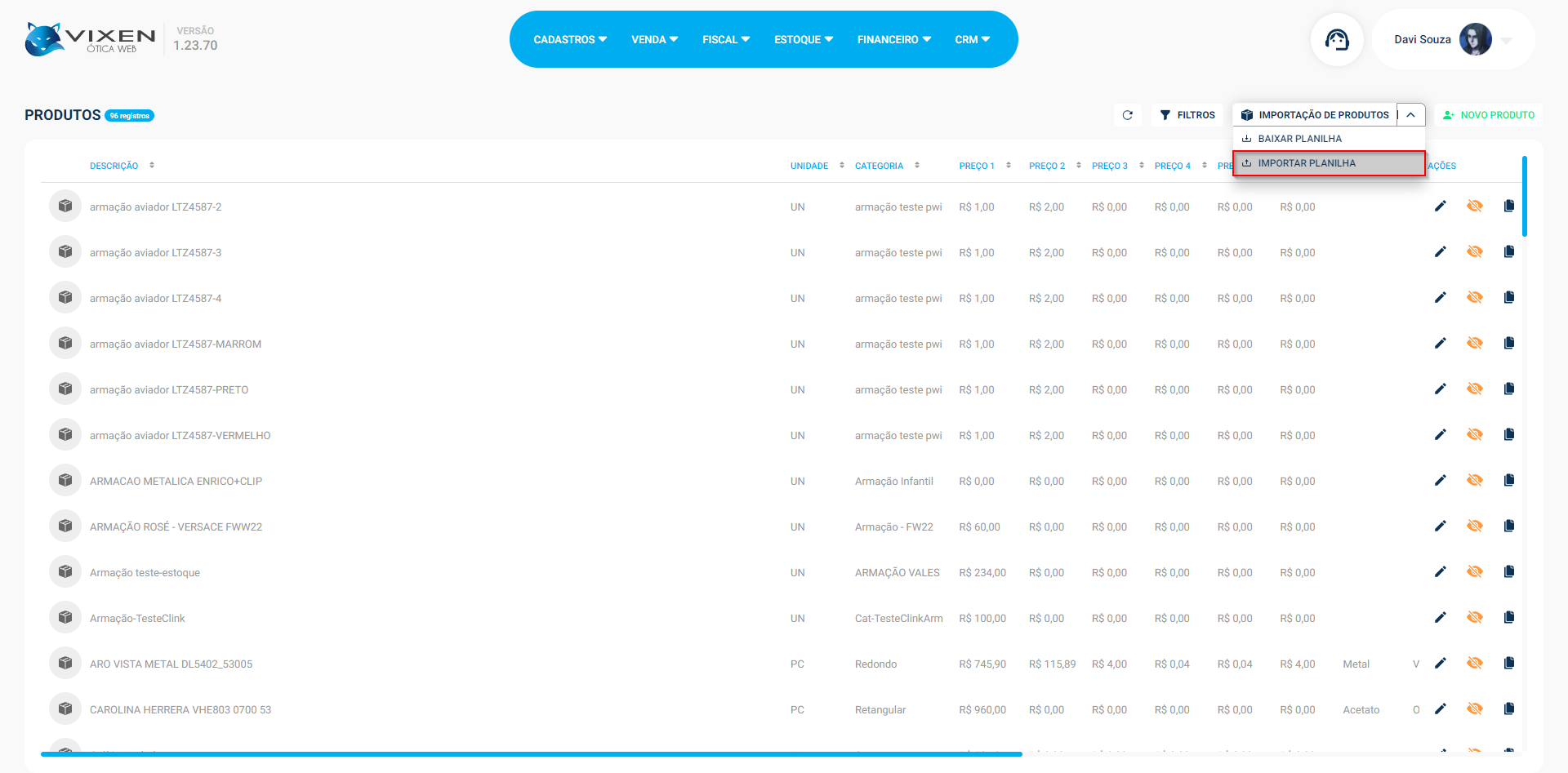 Após preenche-la vamos voltar no Vixen Ótica Web e selecionar novamente a opção “importação de produtos”, mas dessa vez, vamos clicar em importar planilha: