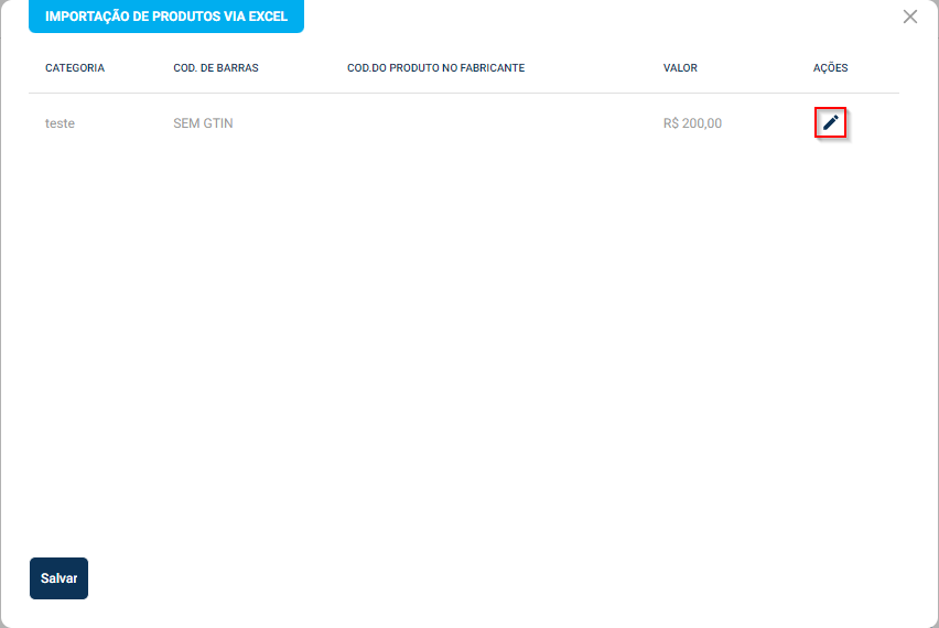 Em seguida, o sistema nos trará uma tela com o resumo dos produtos que queremos importar, nos dando a opção de alterar um por um clicando no lápis que indica o menu “ações”: