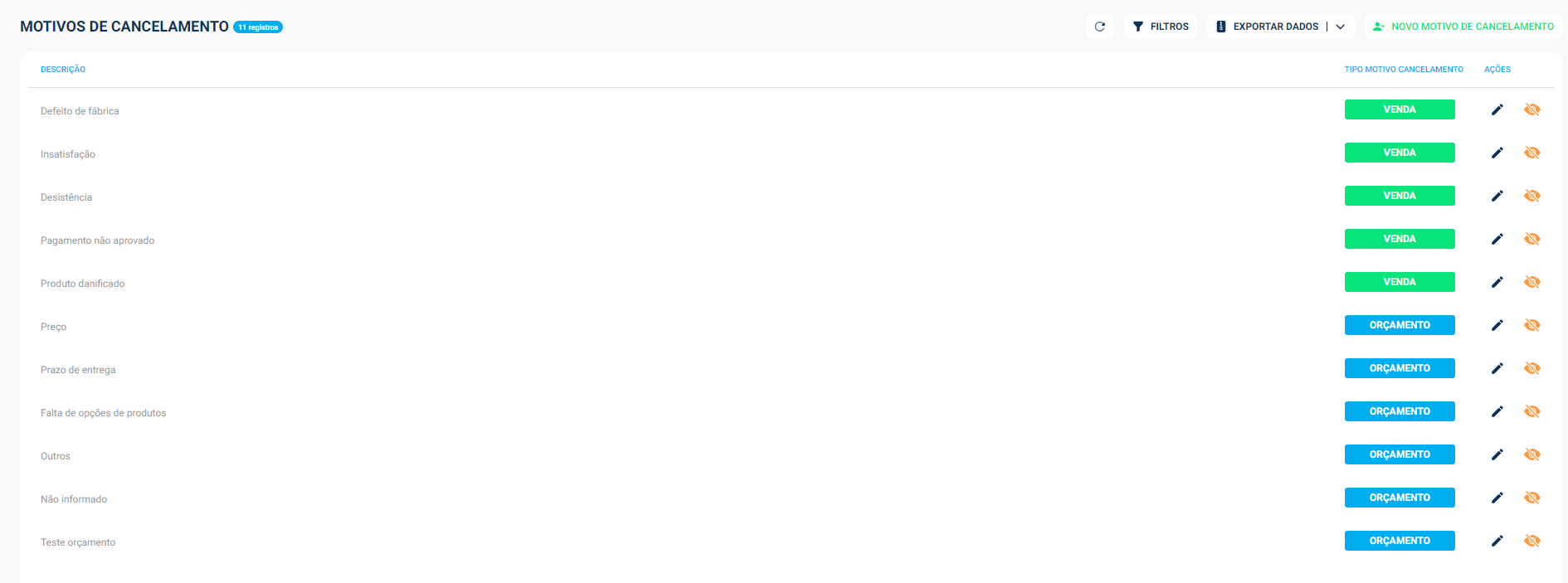 A tela de Motivos de Cancelamento do Vixen Ótica Web te permite gerenciar e cadastrar motivos de cancelamento, tanto para vendas quanto para ordens de serviço.