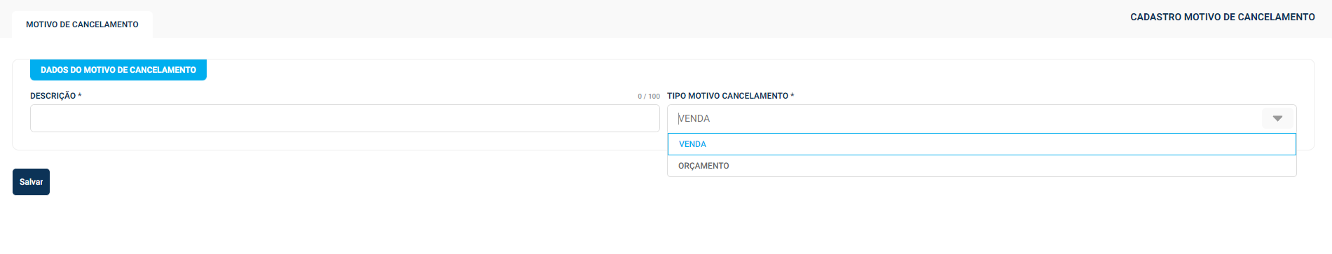Ao clicar na opção de “Novo motivo de Cancelamento de Venda“, será apresentada a seguinte tela: