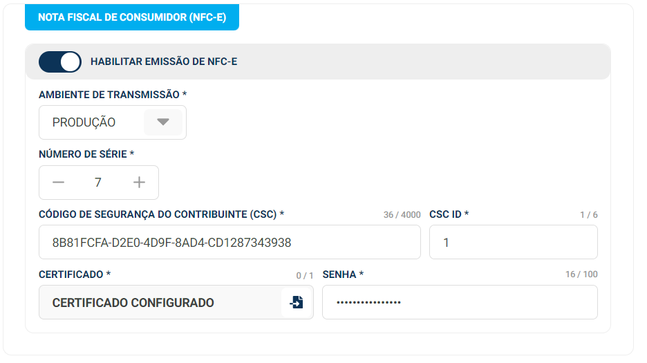 Configurações Nota Fiscal de Consumidor (NFC-e)