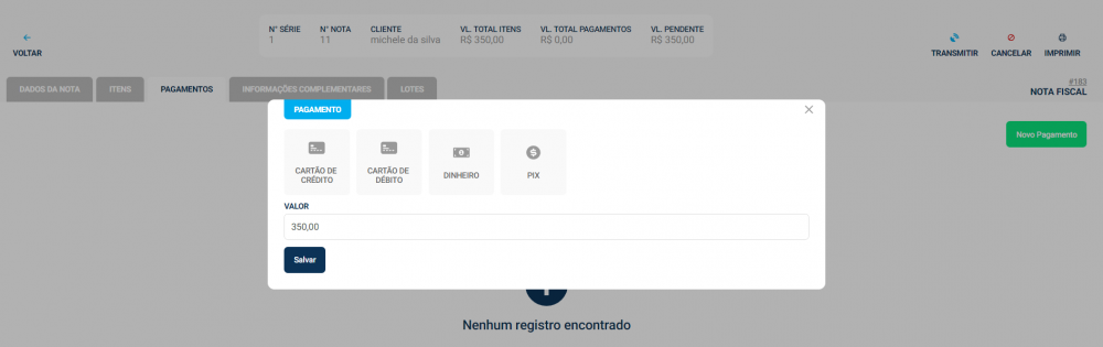 5º Lançado o produto, clique na aba Pagamentos e selecione a forma de pagamento (pode ser mais de uma) e clique em salvar: