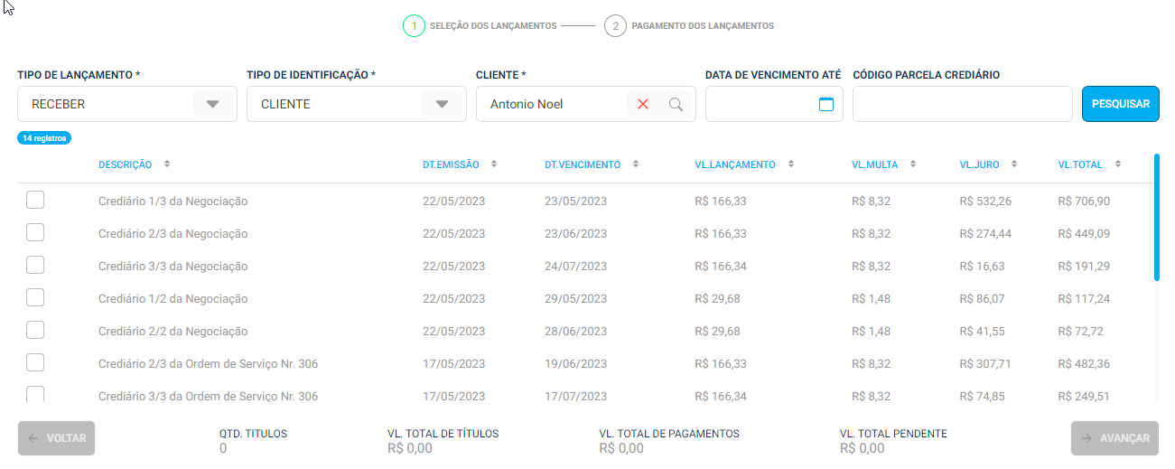 Primeiro você identifica o tipo de lançamentos se é a pagar ou a receber, segundo é o tipo de identificação de pessoa e por fim a localize o cliente ou fornecedor, clique em pesquisar: