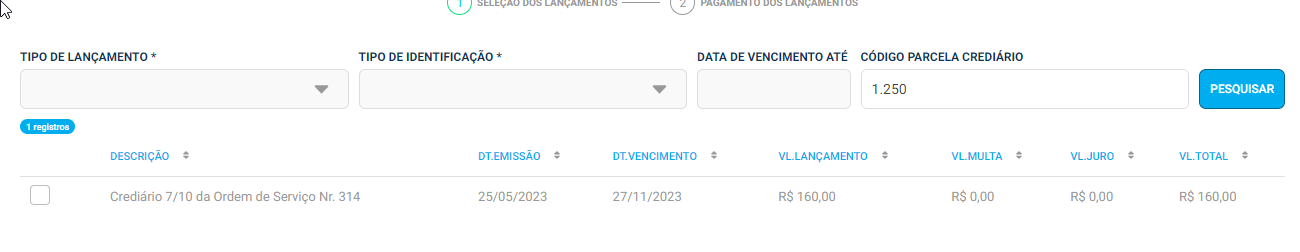 Outra forma de identificar, especificamente os crediários é pelo Código Parcela Crediário, ela se localiza no boleto gerado durante a abertura de uma O.S