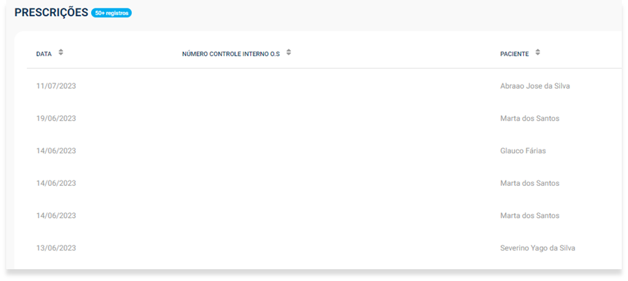 Aqui são listados todos os cadastros existentes. Você pode usar os filtros para pesquisar registros específicos, como: Paciente, Ordem de serviço ou Número Interno.
