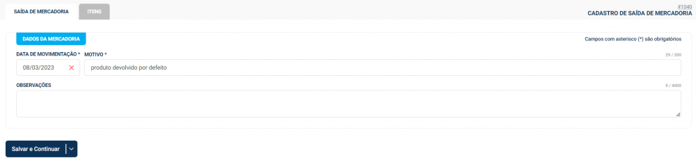 1º - Ao clicar em saída de mercadoria é aberto uma nova tela onde é obrigatório preencher data da movimentação (saída) e o motivo da retira