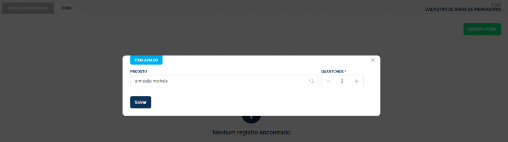 2º - Após clicar em Salvar e continuar é liberado a aba Itens > clique no botão Inserir Itens > selecione o produto e digite a quantidade > clique em salvar
