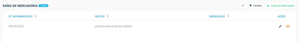 Pronto, a saída do produto foi concluída, na tela inicial será exibida todas as movimentações salvas, pode ser editada ou inativada: