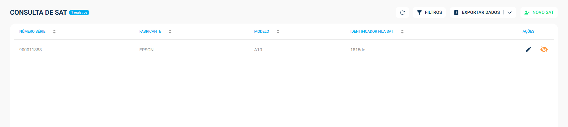 É possível incluir um novo cadastro, usando a opção de “NOVO SAT“, ou então editar as informações de um já cadastrado, clicando no icone de edição do lado direito da tela.