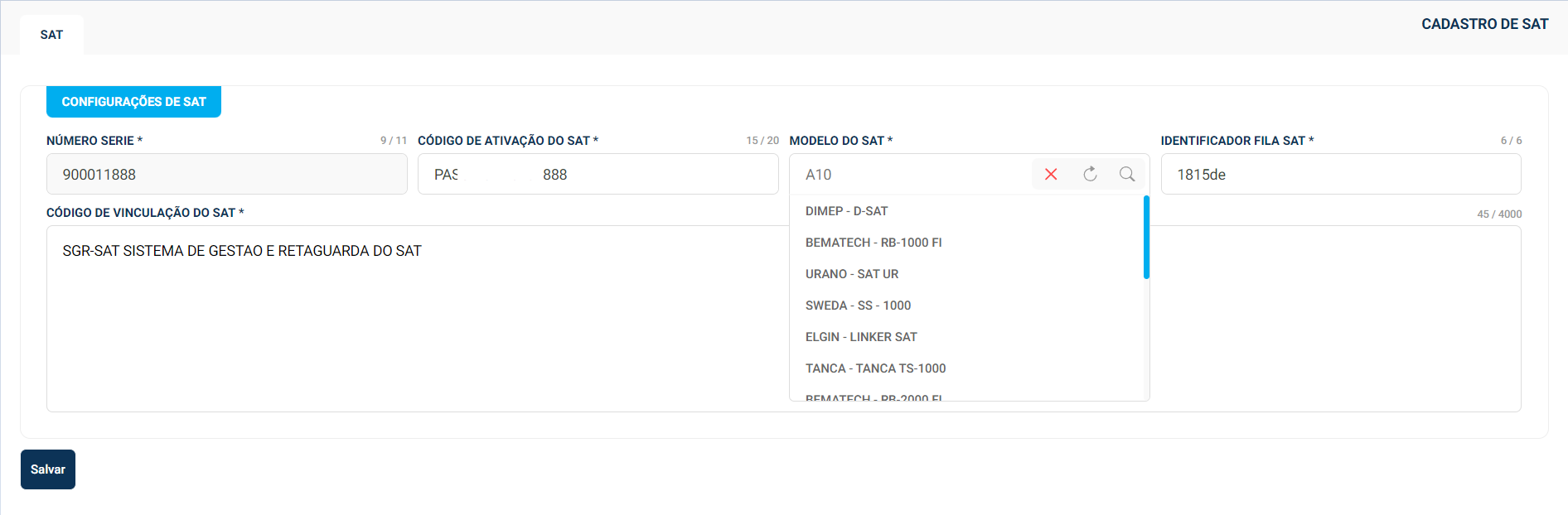 Cadastros > Configurações > Sats > Novo SAT