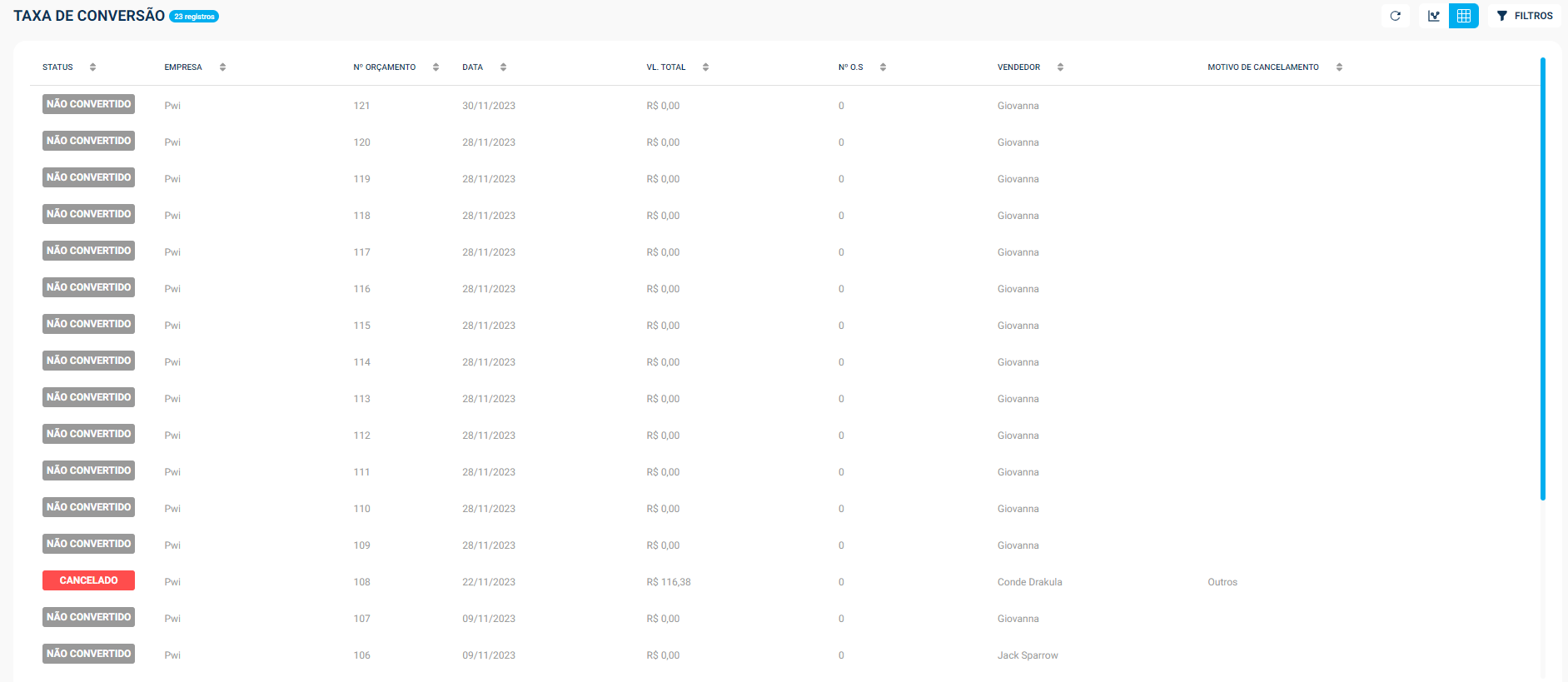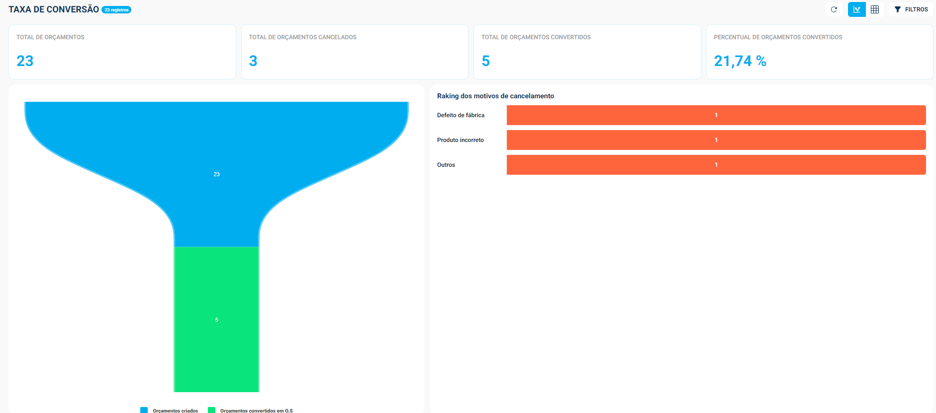O relatório de Taxa de Conversão de Orçamento do Vixen, te oferece uma visão detalhada sobre a eficácia das conversões de orçamentos para ordens de serviço (OS) e, por fim, para vendas efetivas.