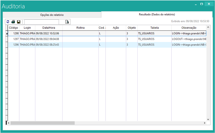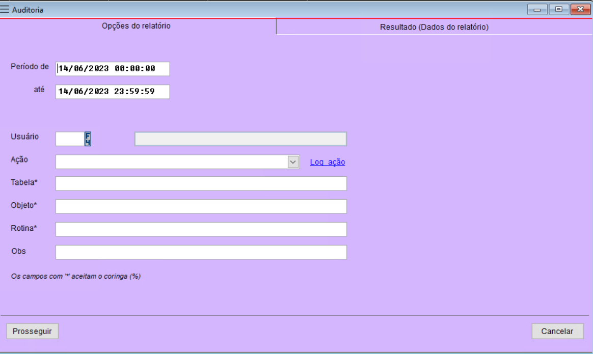 Ação → É possível filtrar uma ação específica do sistema, sendo elas de Inclusão ou Modificação.