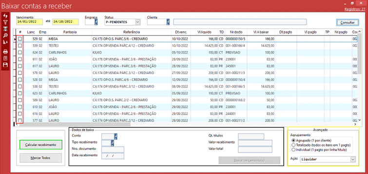 Para realizar a baixa do título, devemos primeiro selecionar a flag no lado direito dele, e em seguida clicar em “Calcular recebimento”. Com isso, devemos preencher algumas informações acerca dessa baixa: