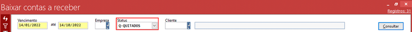 Caso queira consultar os titulos já baixados, basta retornar a tela “Baixa da lançamentos” e alterar o filtro “Status” no canto superior da tela para “Quitados”, conforme vemos abaixo: