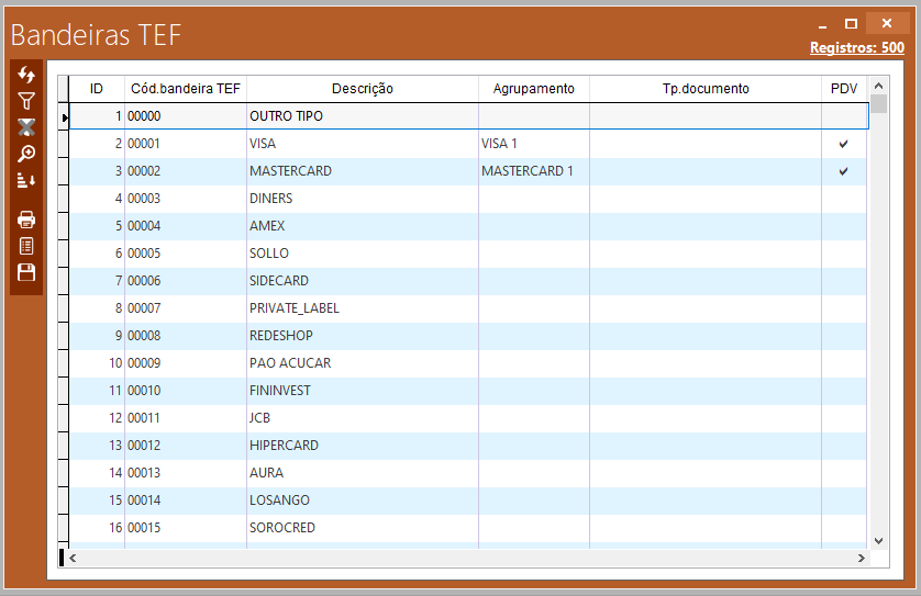 Ao abrir a tela em questão, vamos nos deparar com uma lista de todas as bandeiras já existentes no sistema. Vale ressaltar que não é possível alterar o nome ou incluir novas bandeiras no sistema.